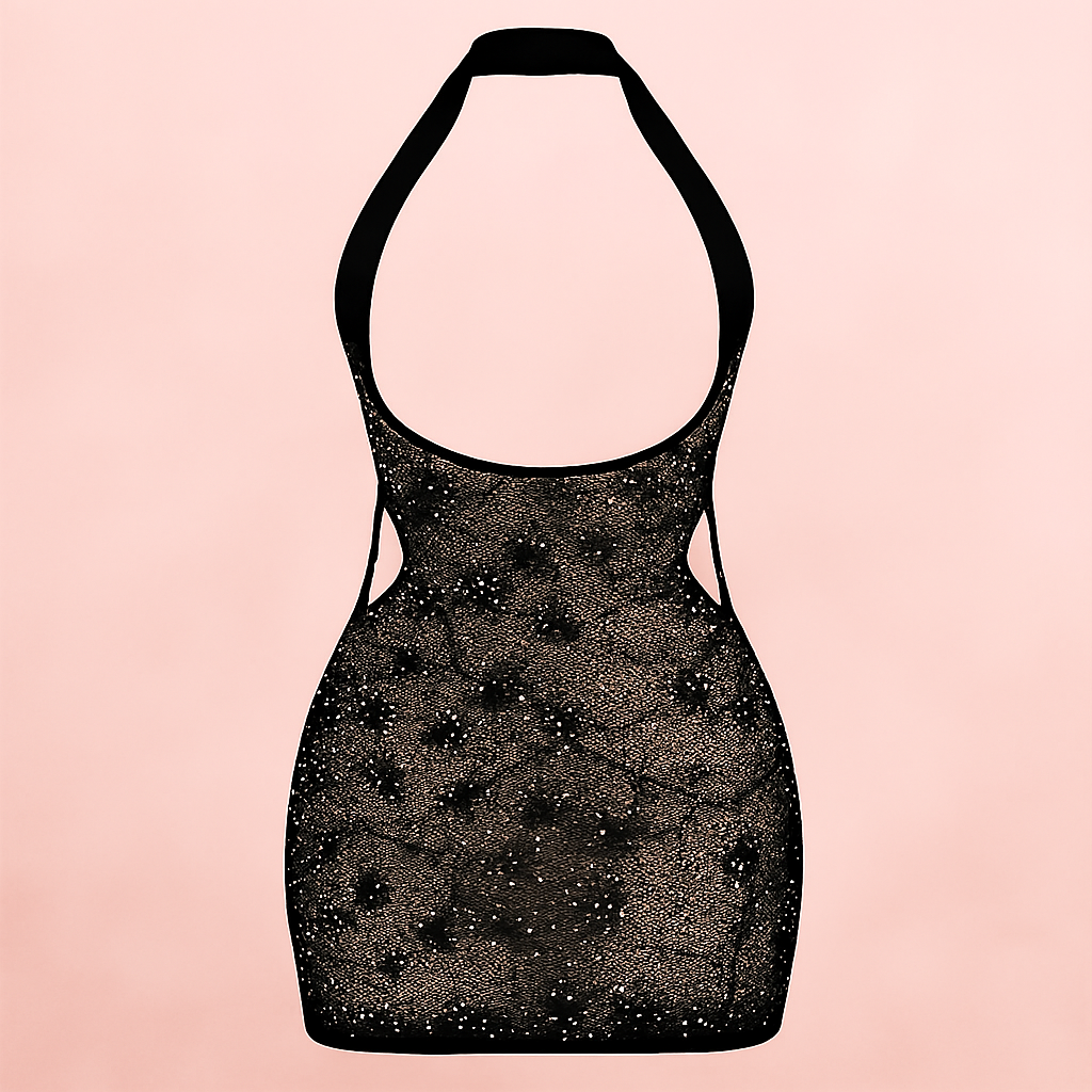 Sheer Glitter Halter Mini Dress – Keyhole Front, Open Back, Body Stocking Style (Black, Free Size)